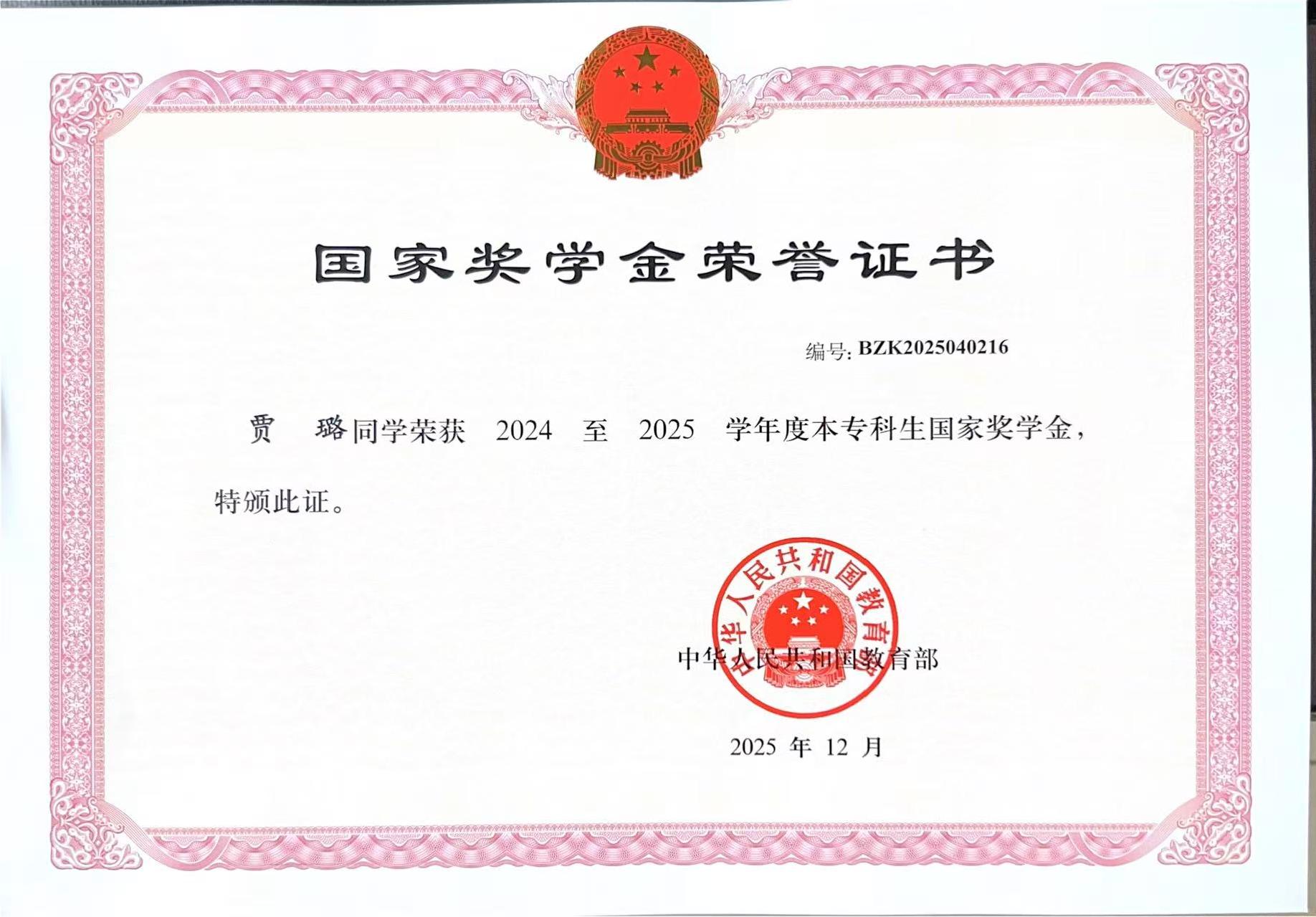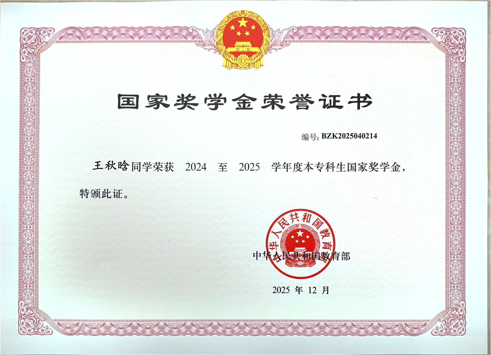 喜报!香港六合彩开奖结果 3位同学获得国家奖学金证书