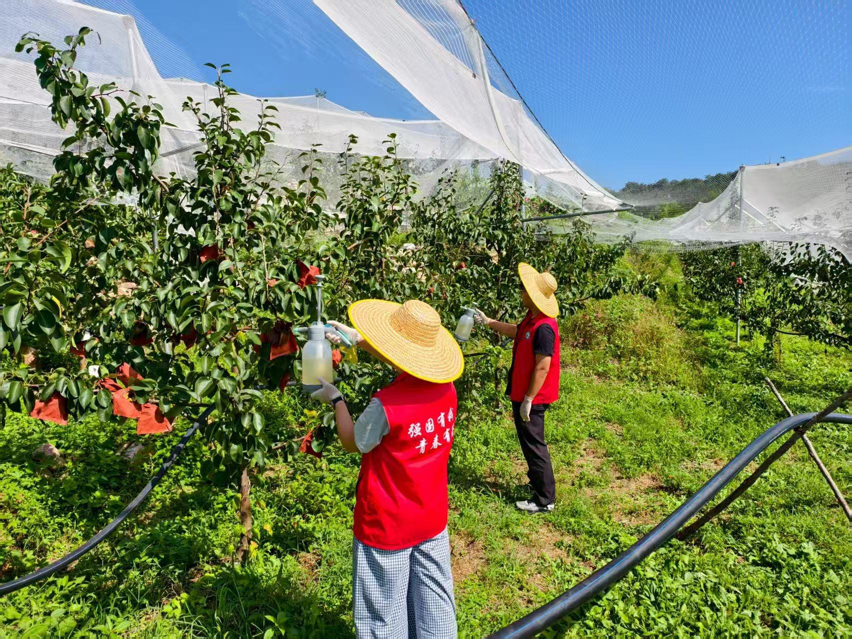 传统农药是‘见虫杀虫’,而微生物菌剂是‘未病先防’。”任争光教授蹲在试验田旁,指着刚喷施过菌剂的梨树解释道。为提升茅山后村梨果的产量和品质,团队积极推广以生物防治技术为主的绿色防控技术,有效利用天敌,同时推广有机肥和微生物菌肥的使用并改良土壤,目前这些技术的使用率已达到70%,还建立了40余亩的绿色防控技术示范园,以提升果农专业化管理水平。实践团使用多种生物菌剂和化学药剂及对照组对梨黑斑病进行防治测试,通过统计梨树叶片的感病数量来分析哪种生物菌剂的治疗效果最佳。