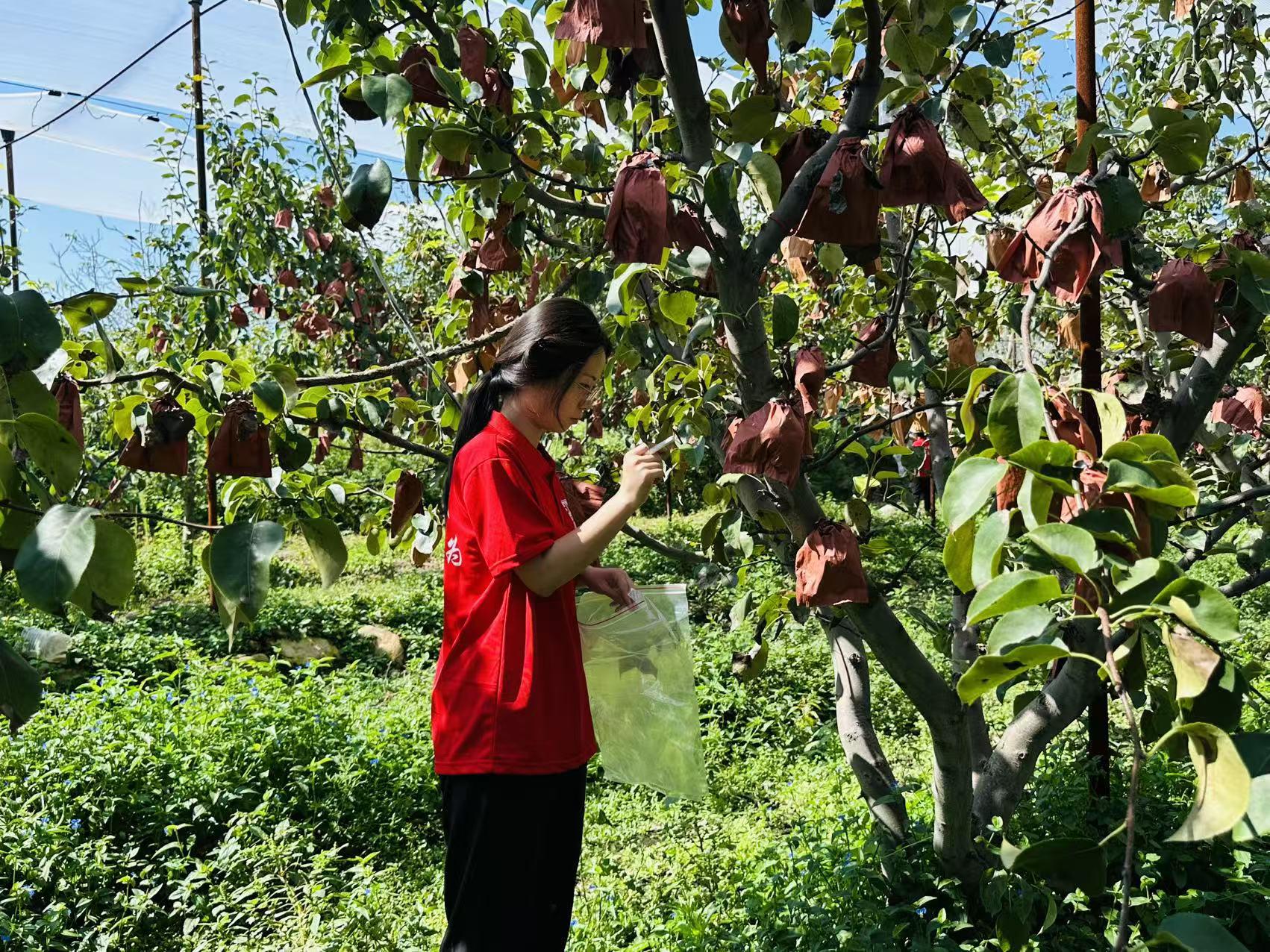 实践团采用“五点取样法”,对梨园进行网格化调查,在博士农场的标准化梨园与农户果园中采集土壤、叶片及果实样本,对比不同种植模式下的病虫害差异。“课本上说‘通风透光能减少虫害’,但真正蹲在果园里测量枝叶密度、计算光照强度时,才明白这些数据的意义。”实践团成员感慨道。“连续阴雨导致土壤透气性变差,酸性物质积累,容易诱发根部病害。”从理论到实践的闭环,让学生们体会到“把论文写在大地上”的深刻含义。