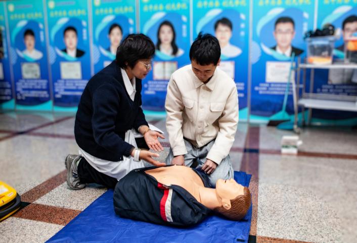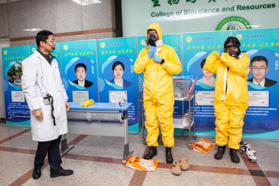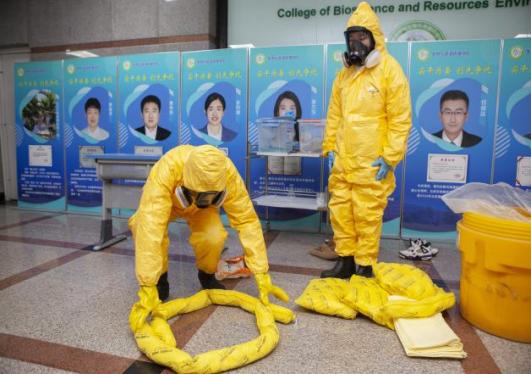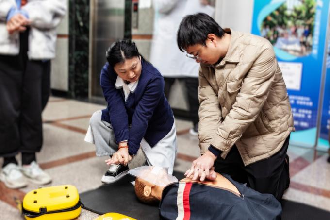 校医院老师详细讲解了使用AED仪器实施心肺复苏的关键要领,并生动演示了异物卡喉时的“石头剪刀布”急救动作。资产处老师带领学生沉浸式演练危化品泄漏实验室的应急处理流程和防护服、面罩、手套的穿戴、摘脱等规范动作,确保安全防护和彻底清理。